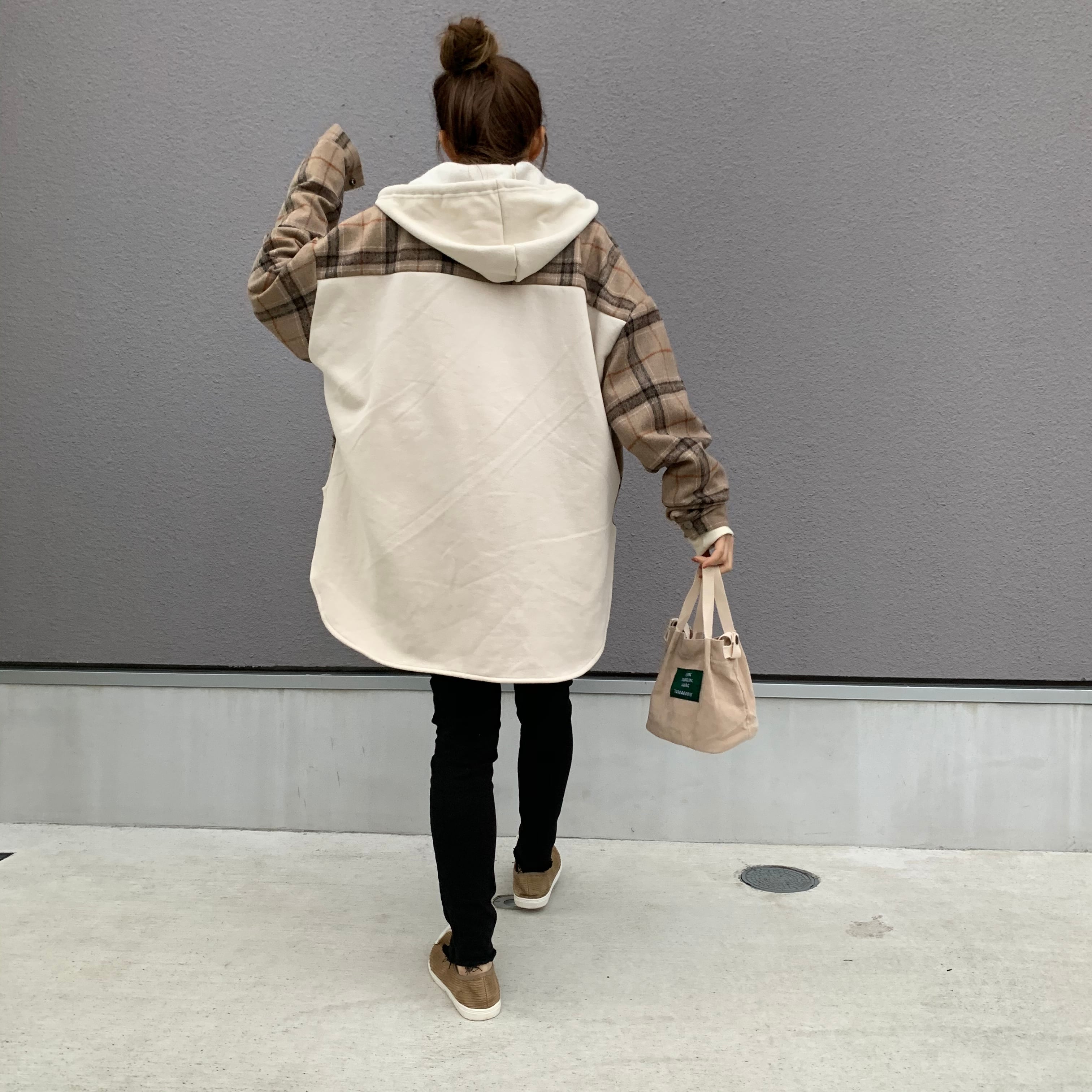 お尻まですっぽりな着丈と、たっぷりシルエットで中にしっかりと着込めるので防寒対策もできて1枚あると便利なパーカーです。