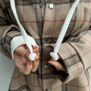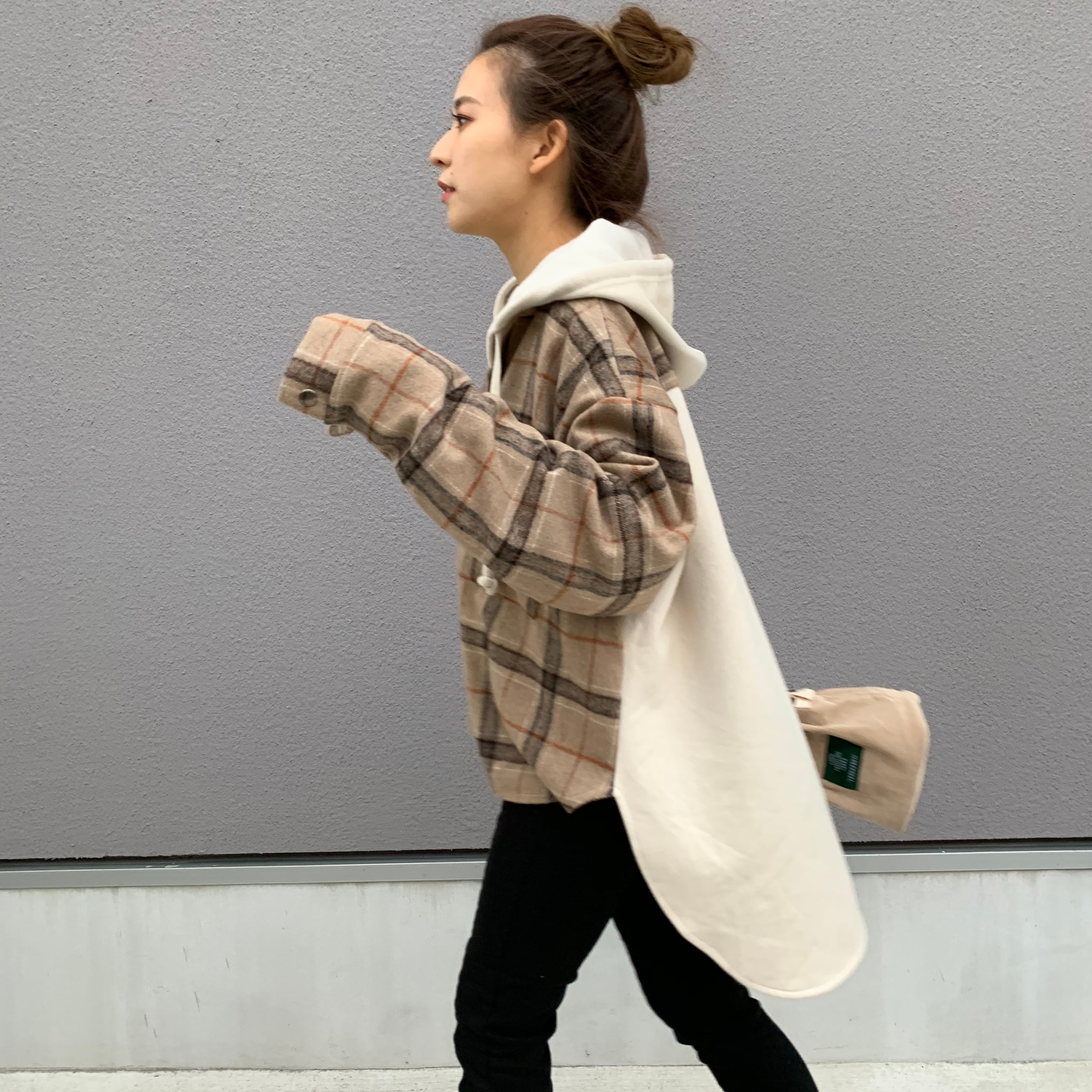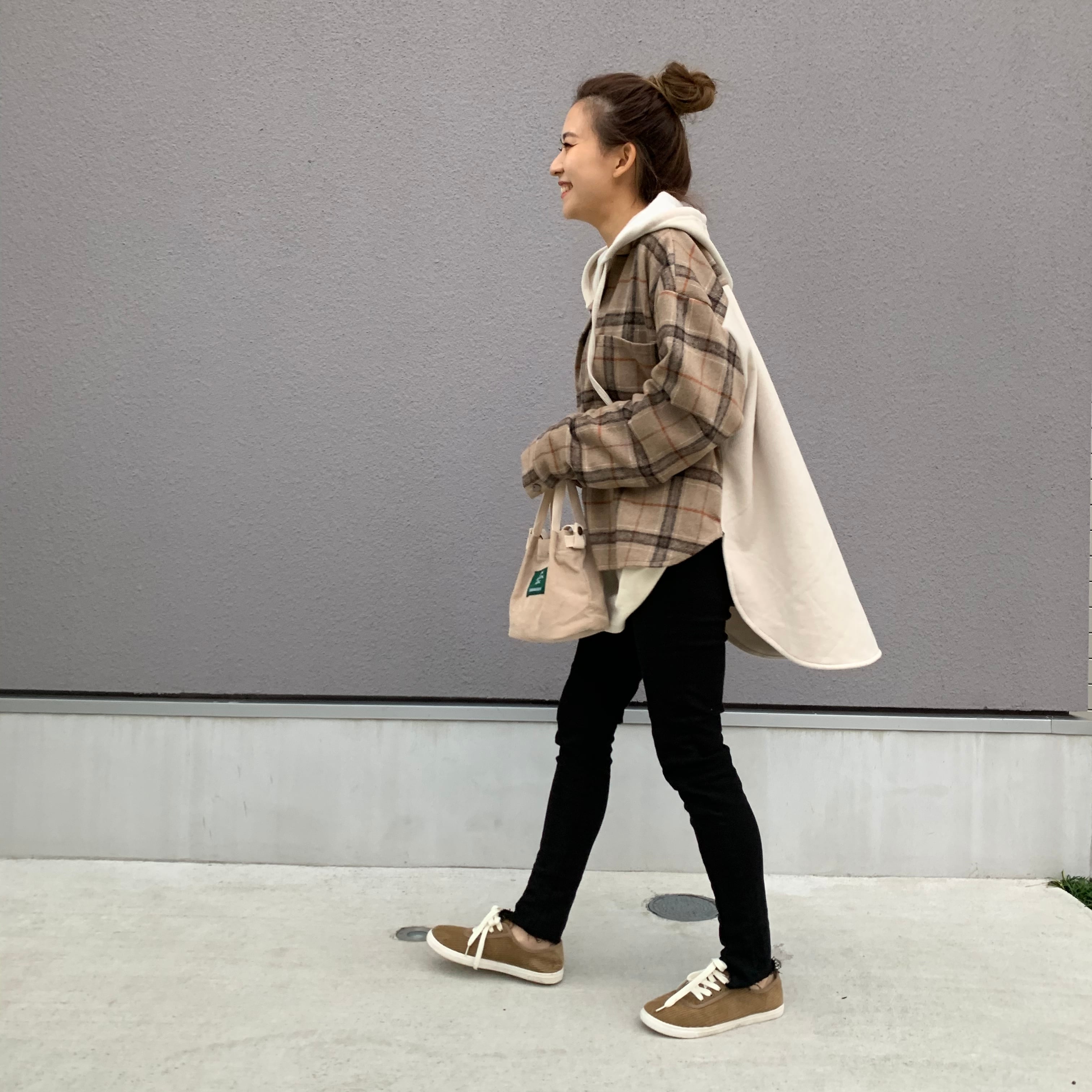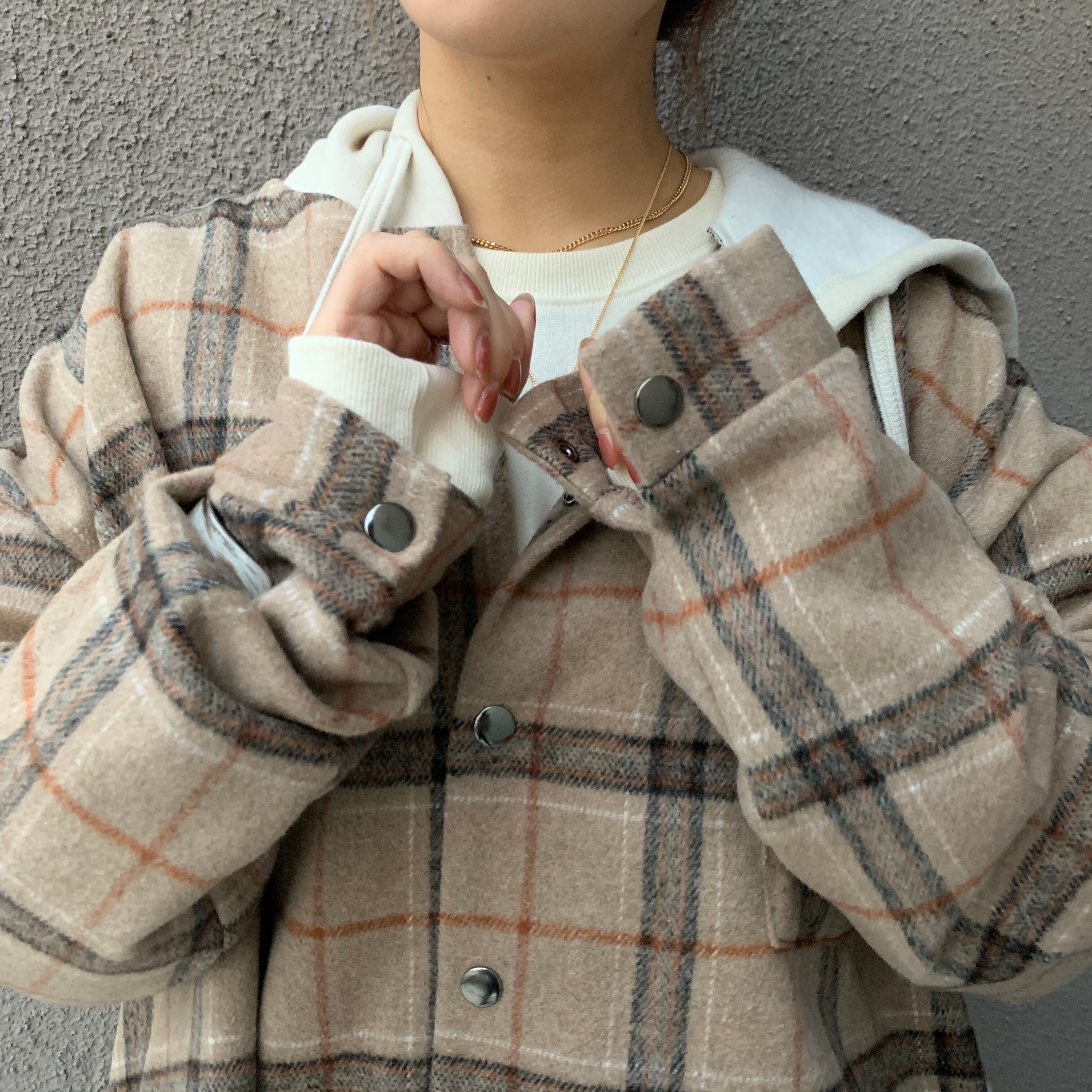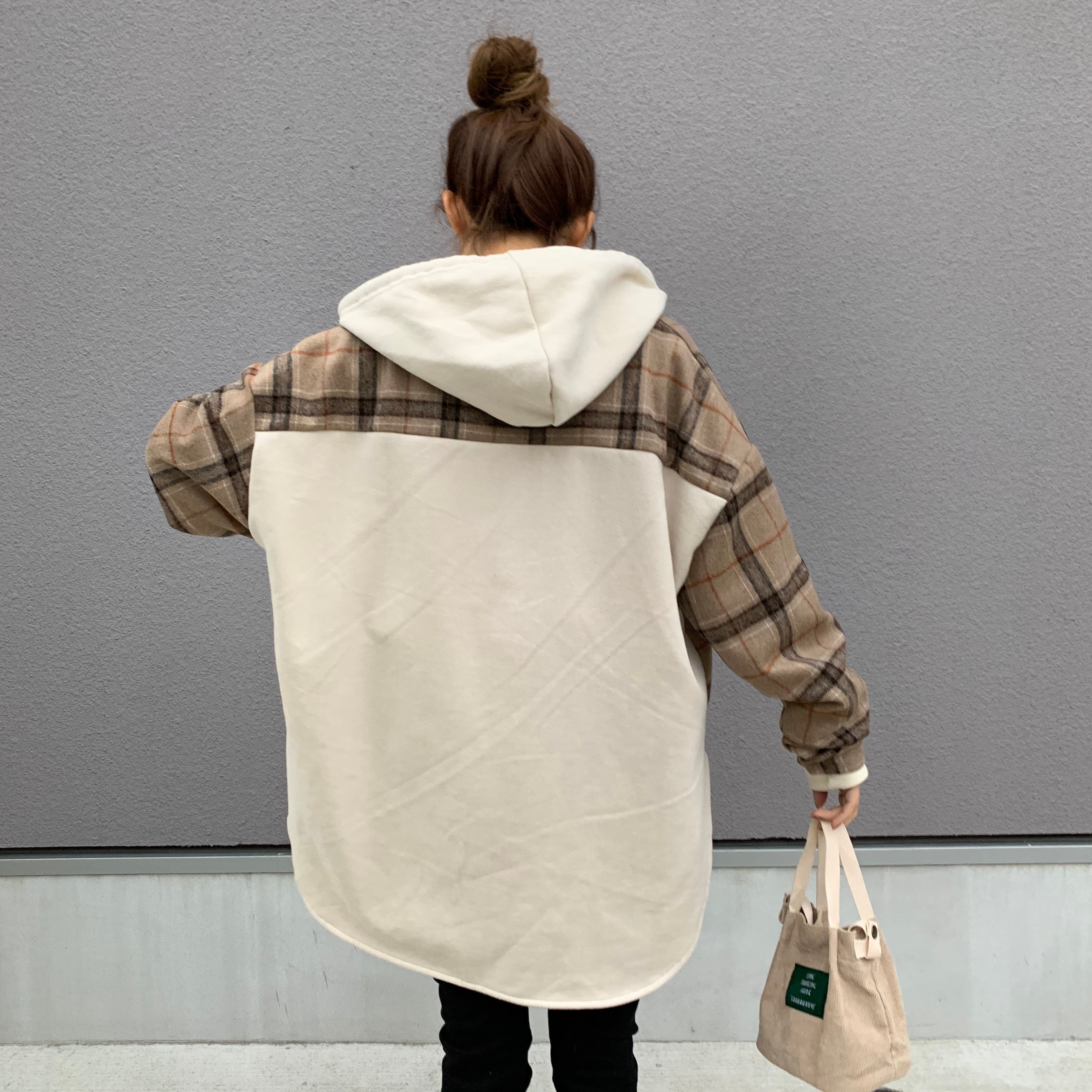 流行のラテカラーが優しい印象のチェックのパーカー。