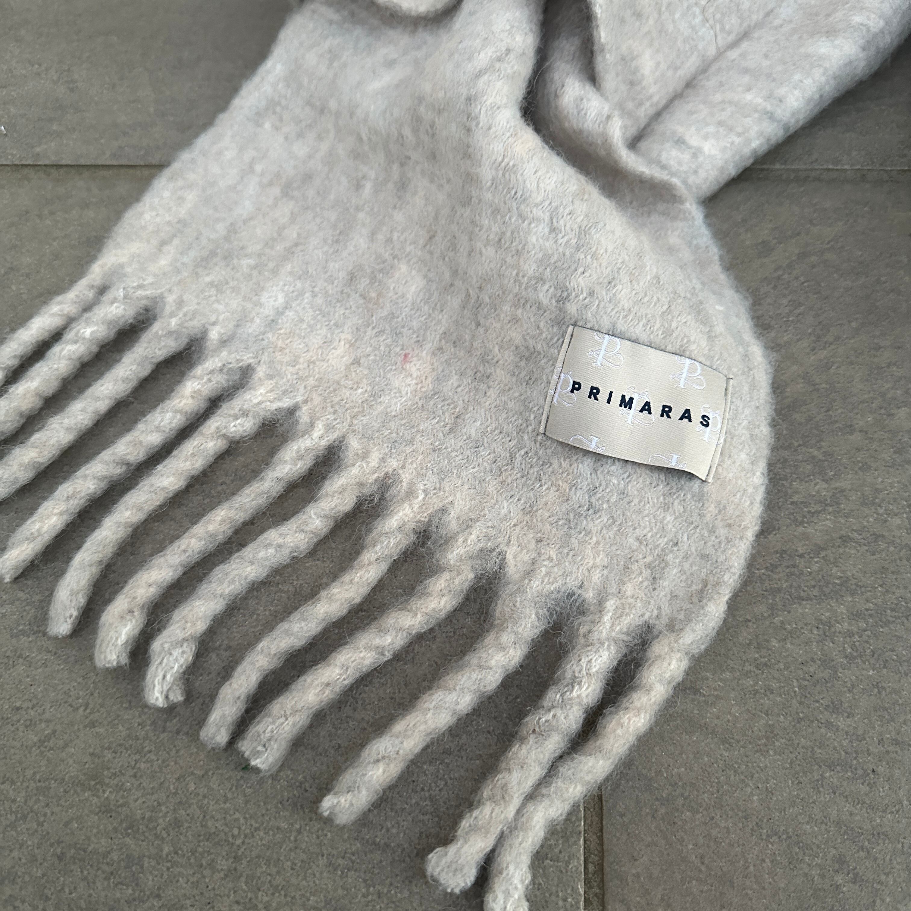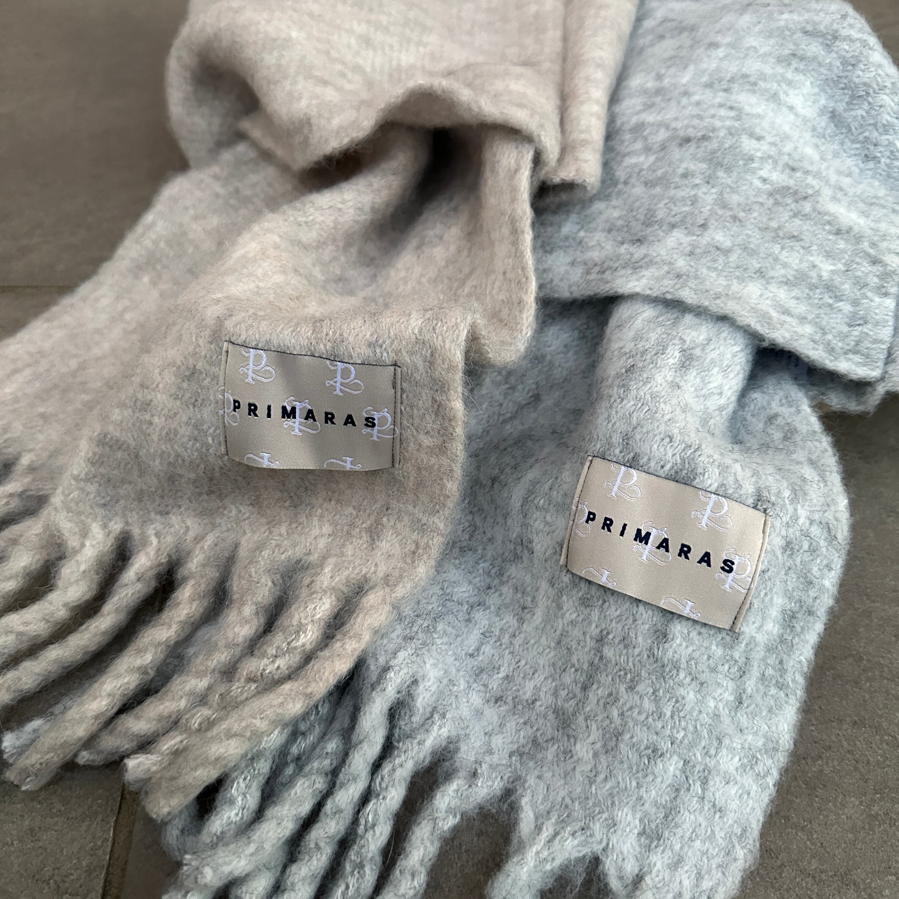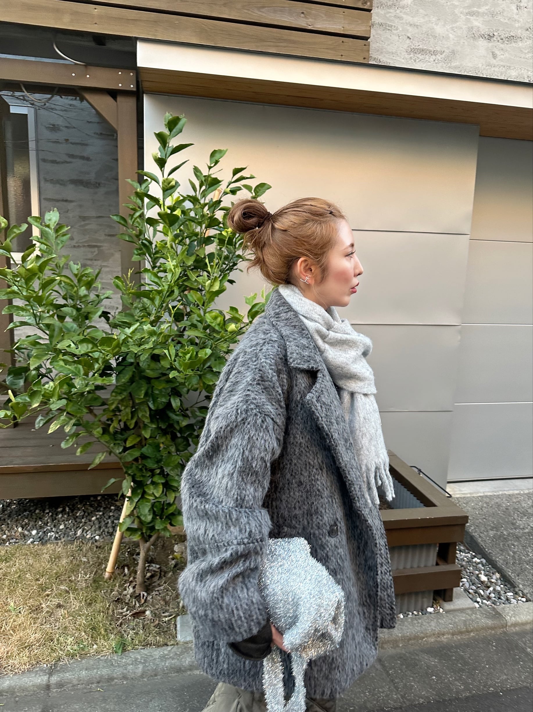 ホールに通すだけで簡単に着脱可能なショートフリンジマフラーです。