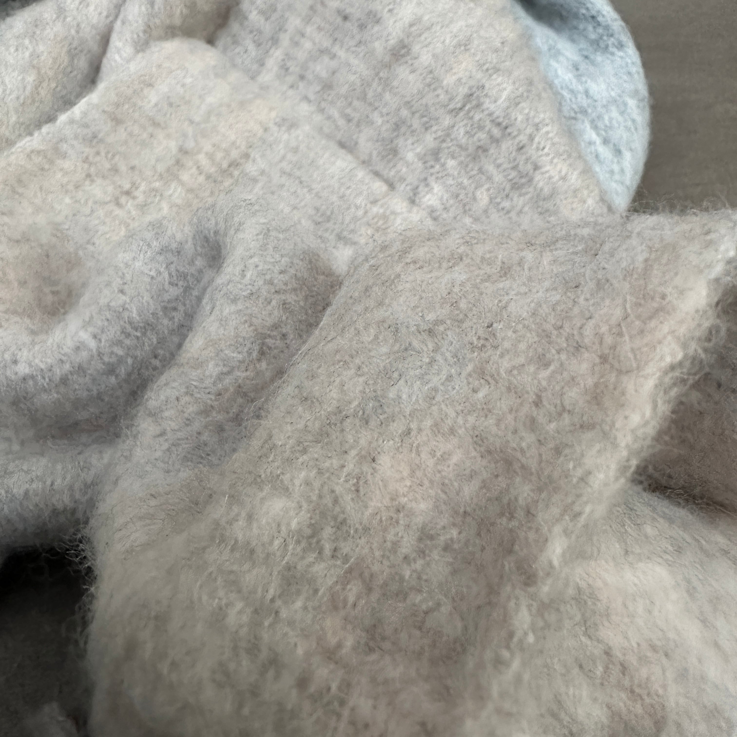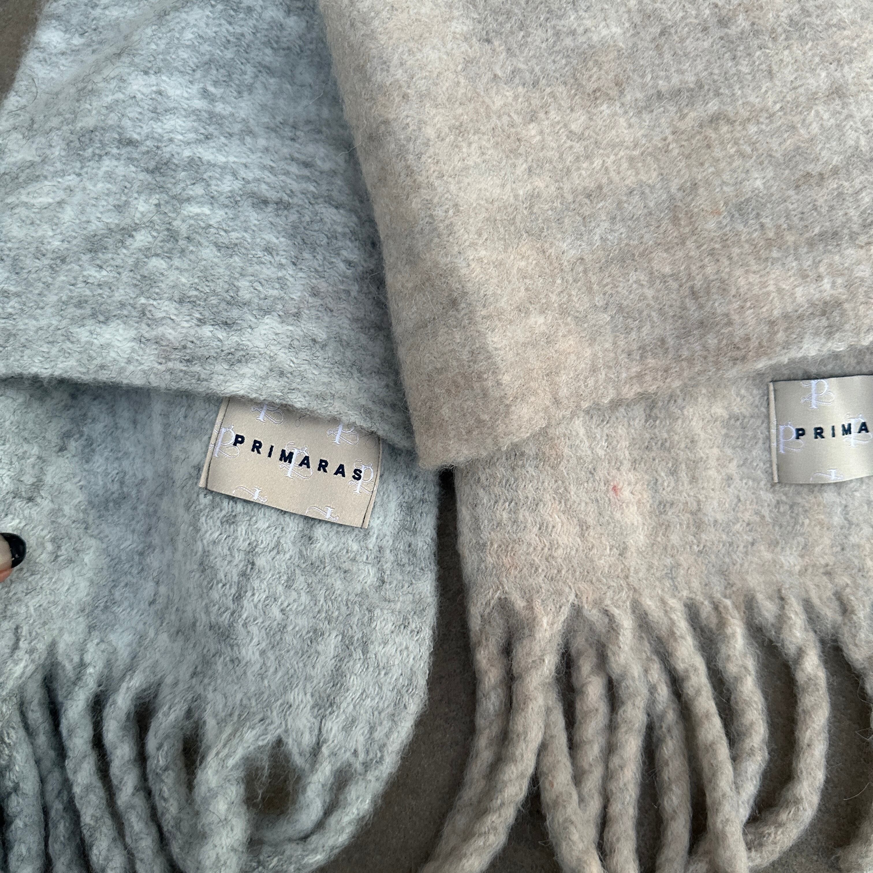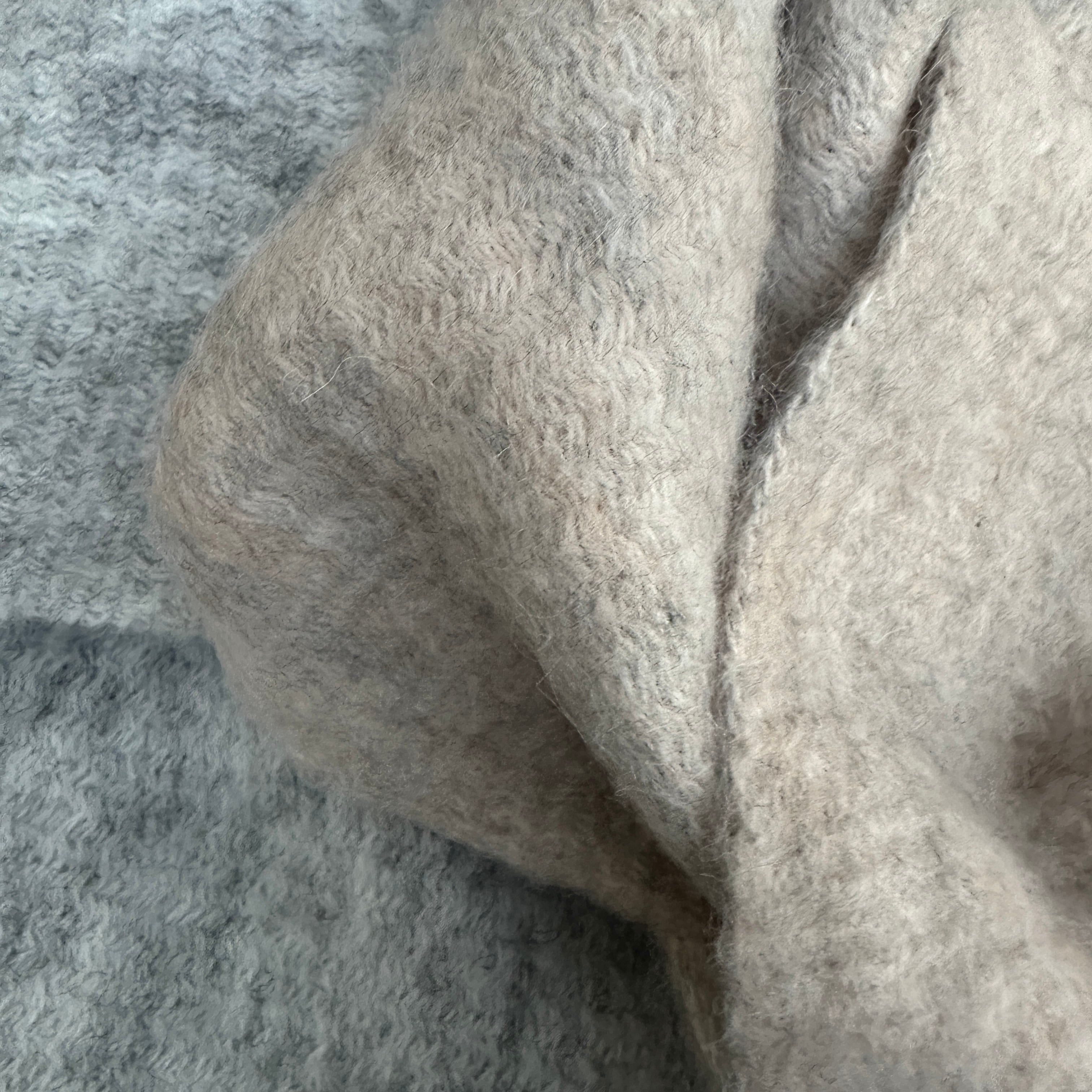 ホールに通すだけで簡単に着脱可能なショートフリンジマフラーです。