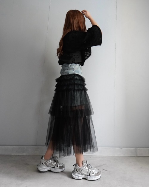 デニムスカートとチュールスカートがドッキングされた1枚でコーデの主役になるデザインスカート・