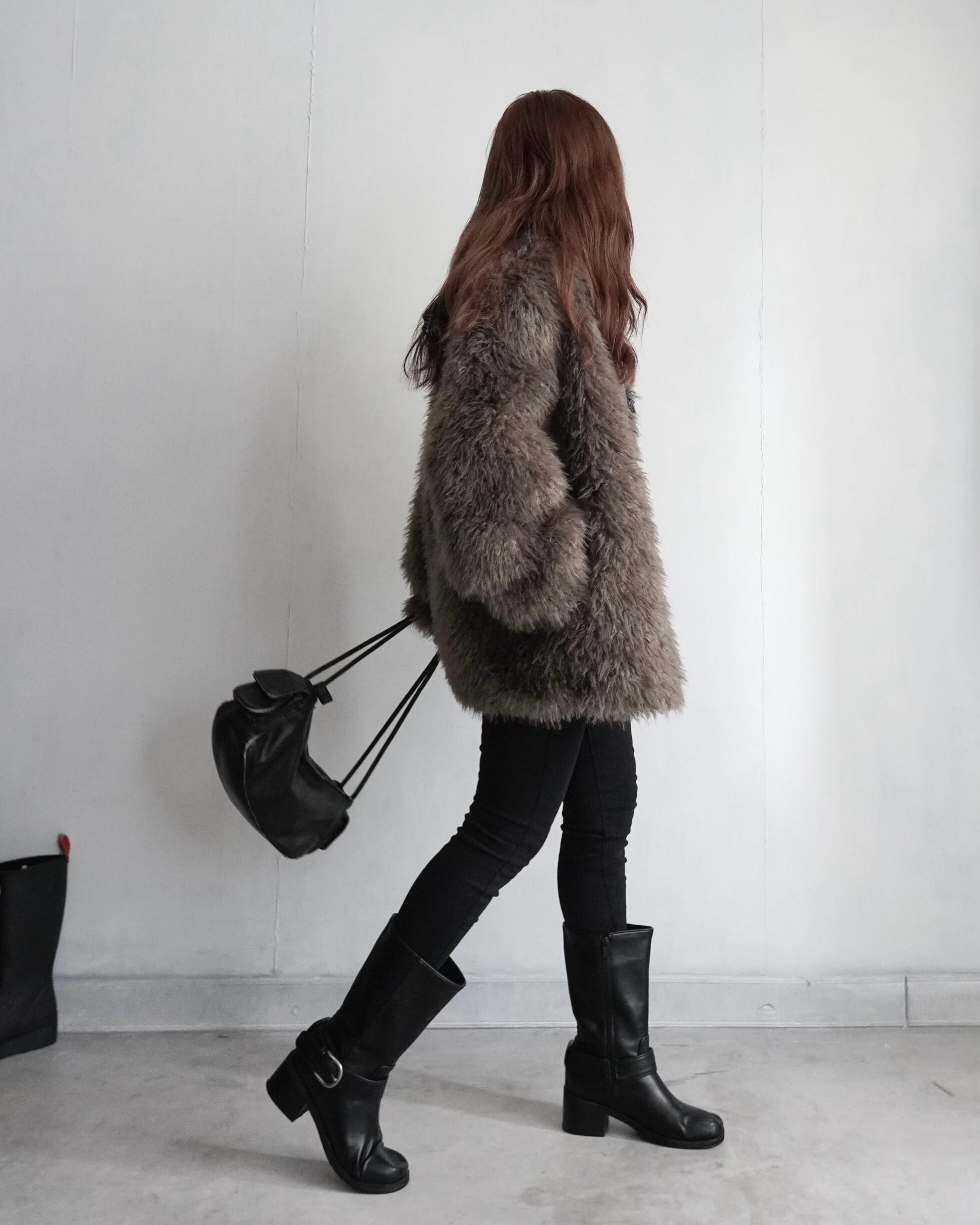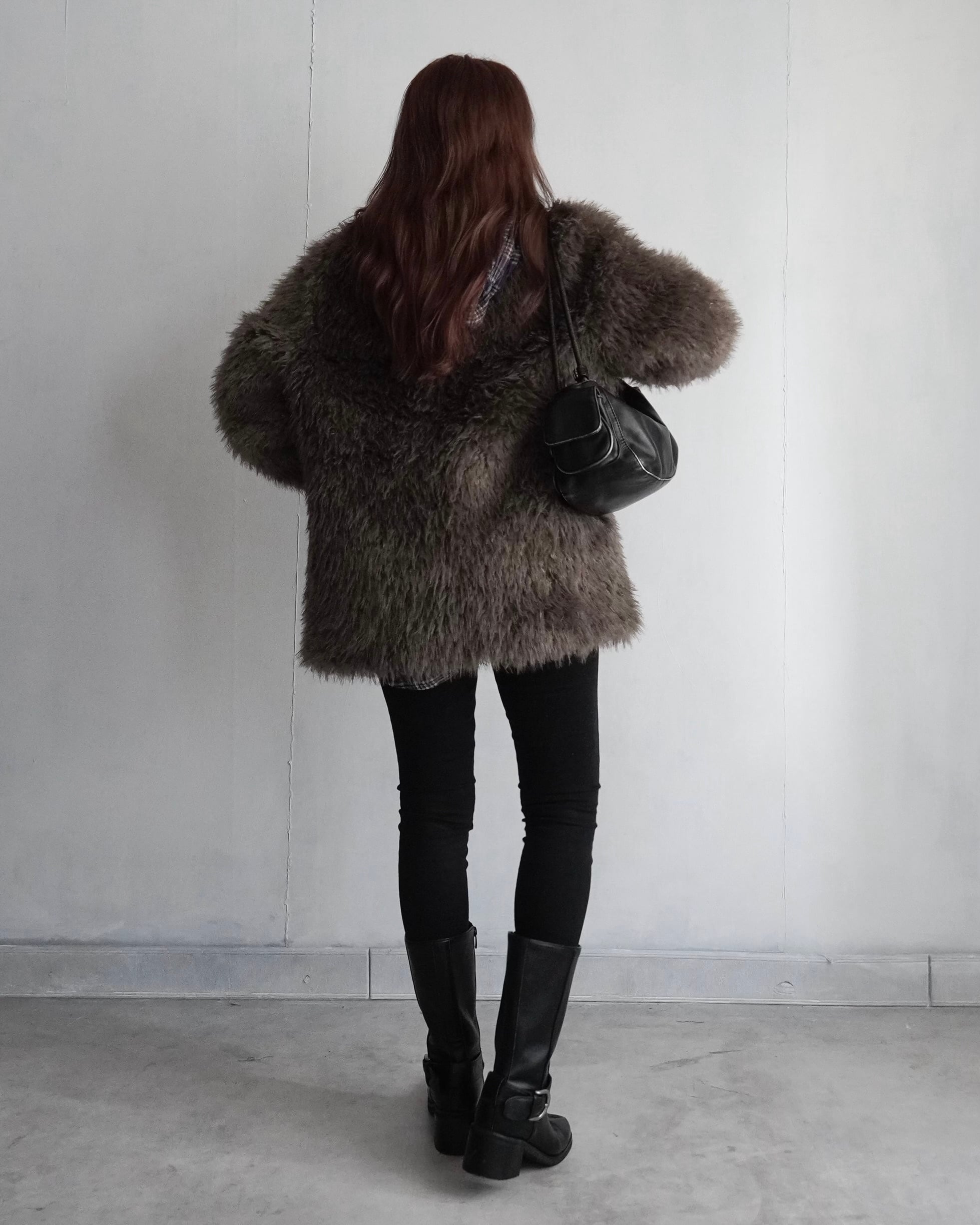 ミックスプードルファー×エコレザーブルゾンコート/ミックスブラウングレージュ
