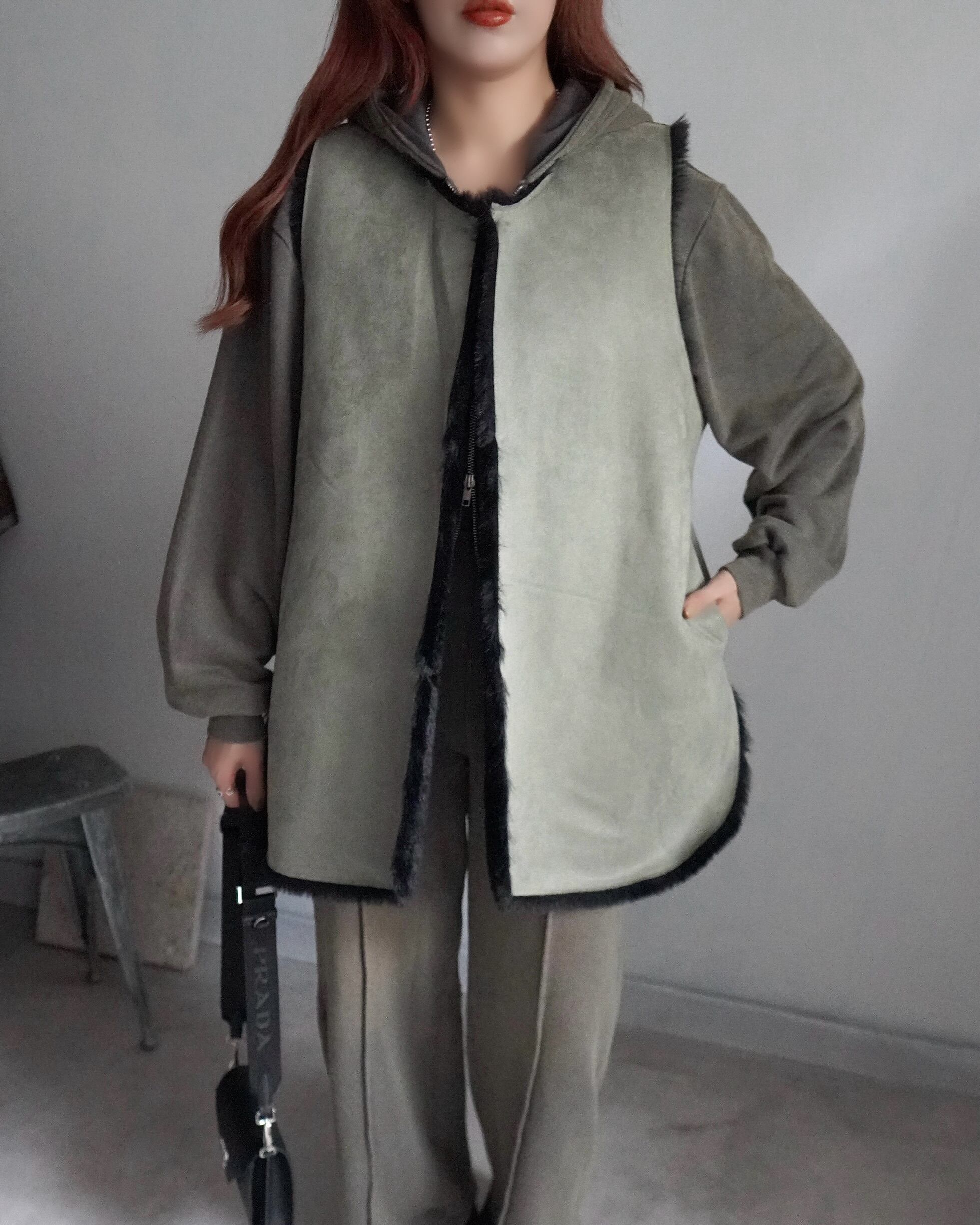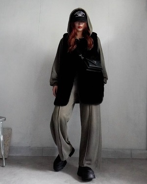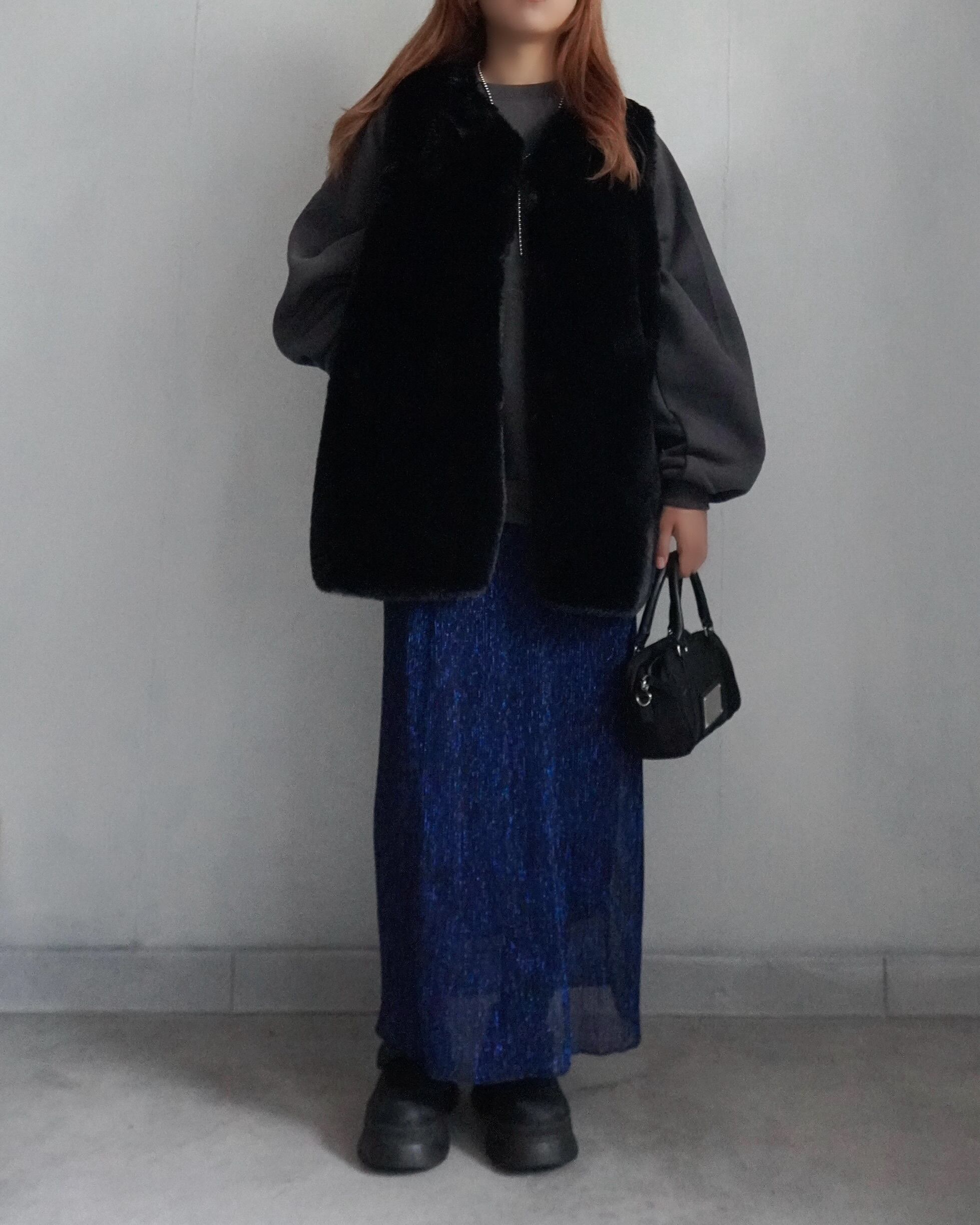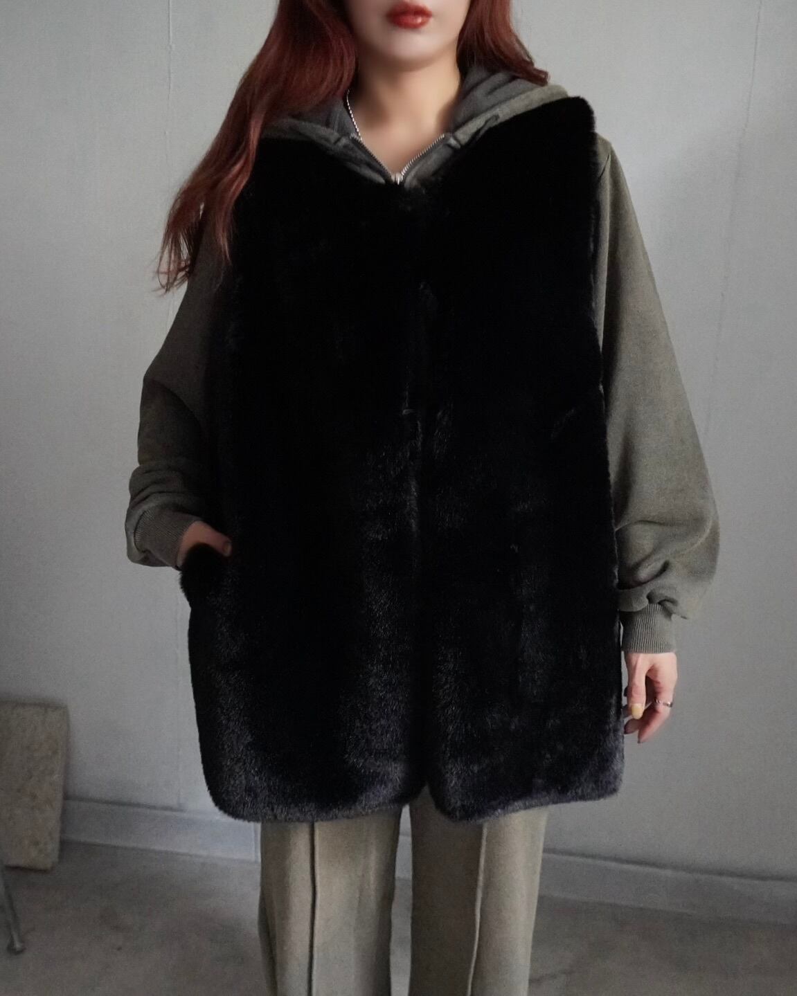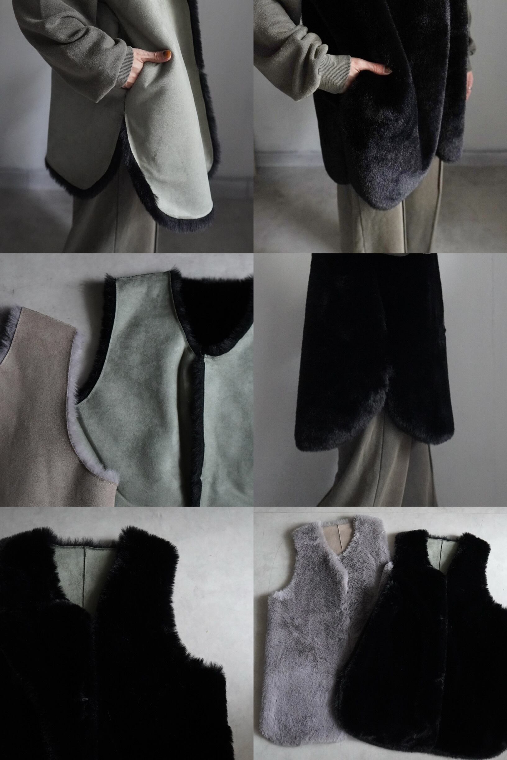 ファー面は滑らかな毛足の短めエコファーで柔らかく品のある毛並み・裏面はムートン仕様となっております。どちらを表に着てもポケット使える嬉しい仕様