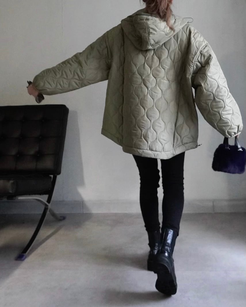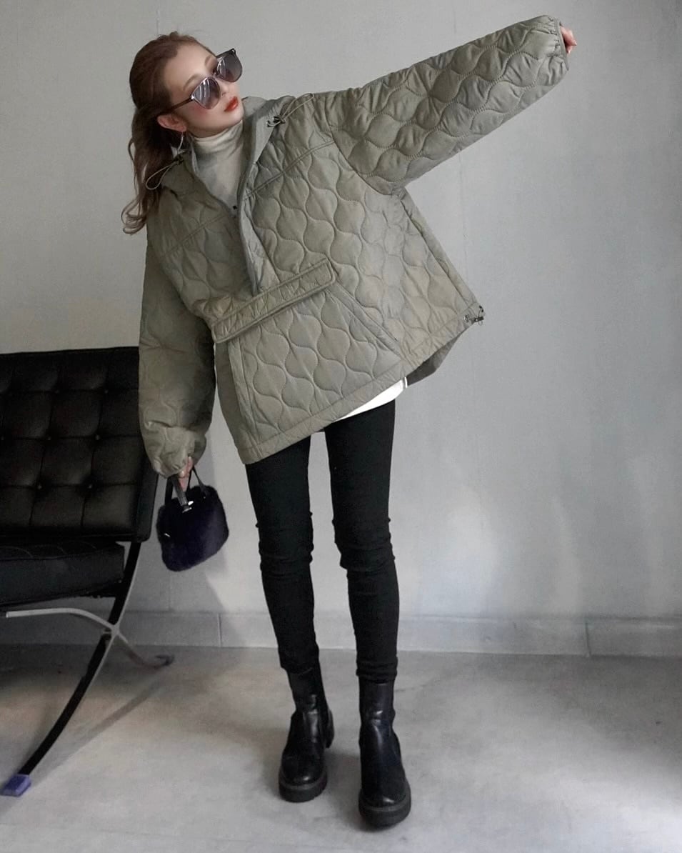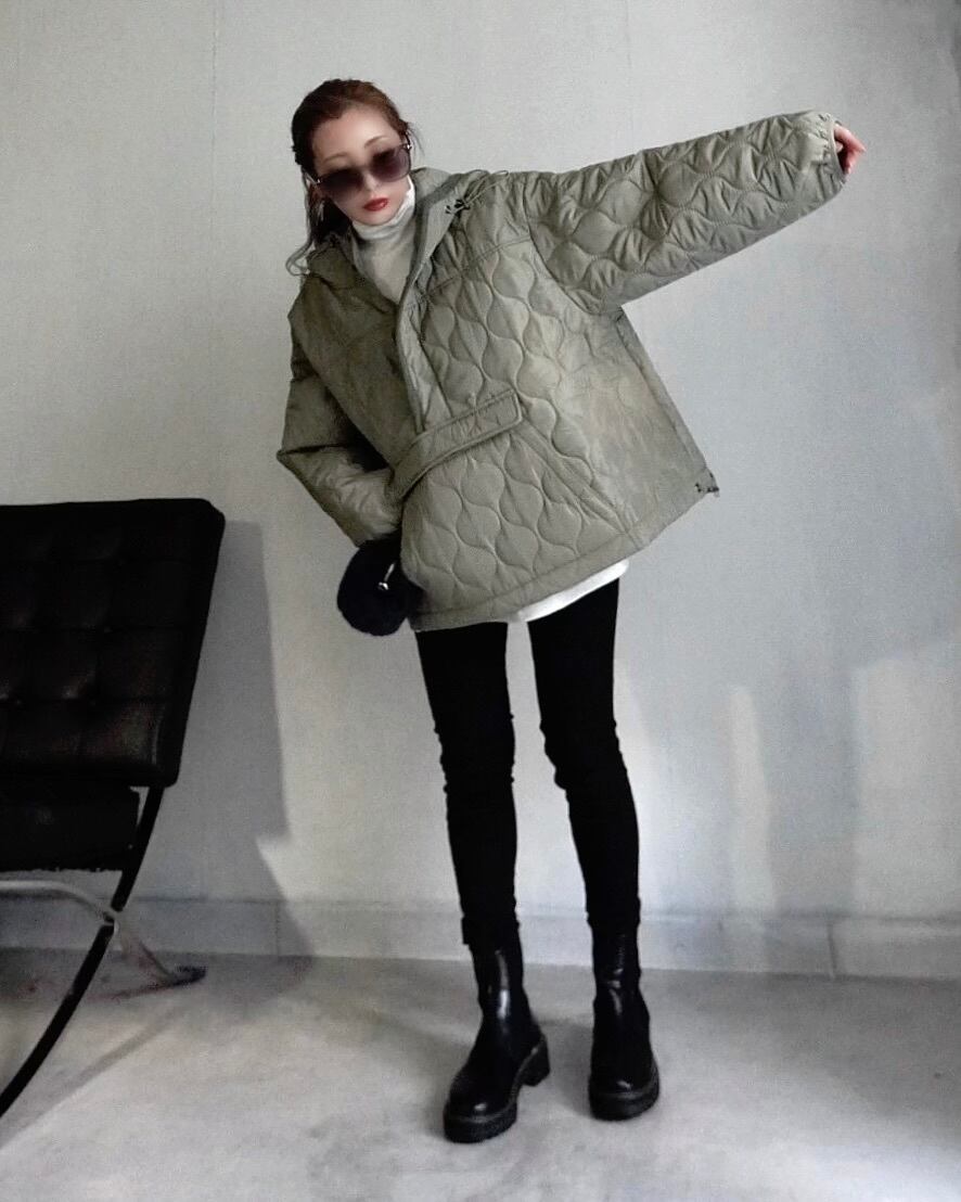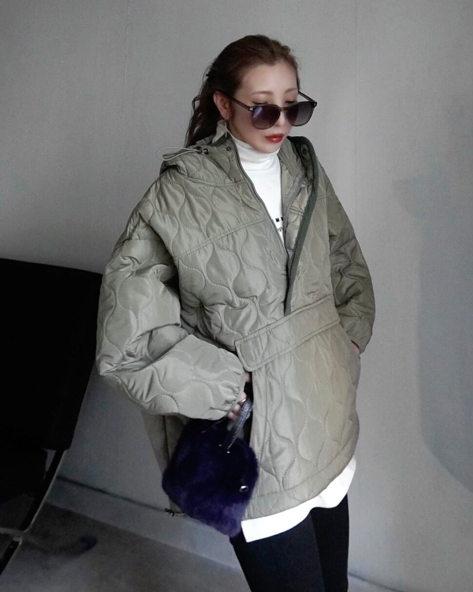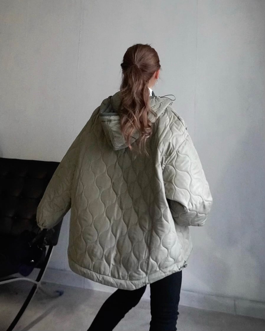 頭からスッポリ被れ、パーカー感覚で着れるキルティングアウター